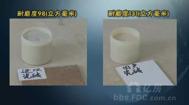 而送檢的進口瓷磚的耐磨度平均值是98立方毫米,送檢國產(chǎn)瓷磚是131立方毫米。送檢的國產(chǎn)瓷磚耐磨度低于送檢進口瓷磚。